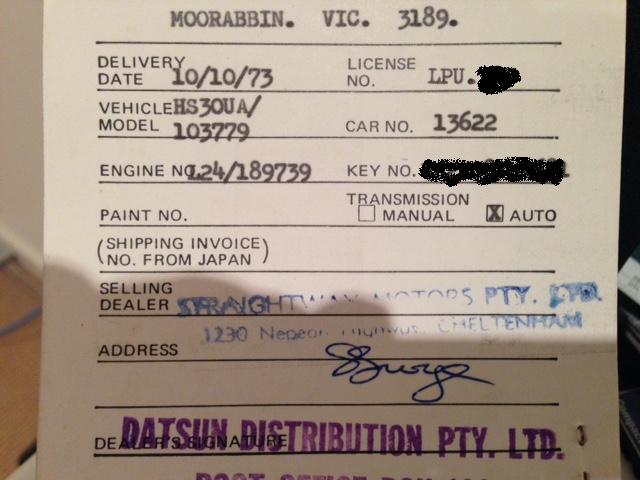 HS30-H Posted May 8, 2015 Author Posted May 8, 2015 My car is a slightly earlier build number but a later date? HS30-103 771 11/1973 The issue of actual build dates is its own can 'o worms. Can be especially tricky when it's to do with compliance/registration dates too. Officially Nissan had finished building HS30-prefixed cars by 11/73, so I assume yours is a compliance date or something like that? A few cars would get out of sequence due to quality control / rectification, so that muddies the water too. I'm just talking about the body serial numbers here really. Quote