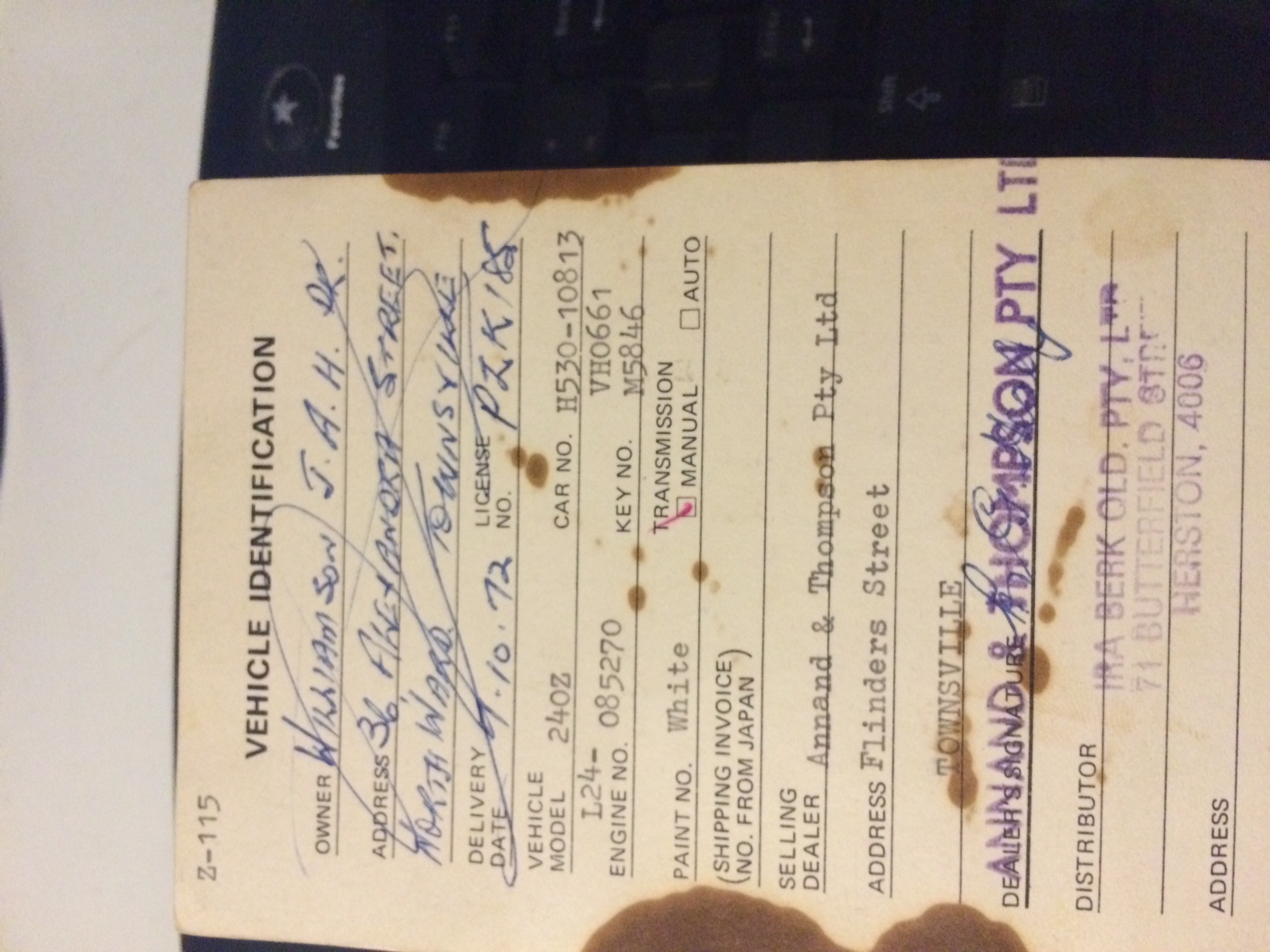 Riceburner Posted May 8, 2015 Posted May 8, 2015 The issue of actual build dates is its own can 'o worms. Can be especially tricky when it's to do with compliance/registration dates too. Officially Nissan had finished building HS30-prefixed cars by 11/73, so I assume yours is a compliance date or something like that? A few cars would get out of sequence due to quality control / rectification, so that muddies the water too. I'm just talking about the body serial numbers here really. Yep that's correct Alan, that date is on the Australian compliance plate. Looking at the register I can see the other late car 103779 is the same color and is also an automatic. Although my car is now a manual. gav240z 1 Quote