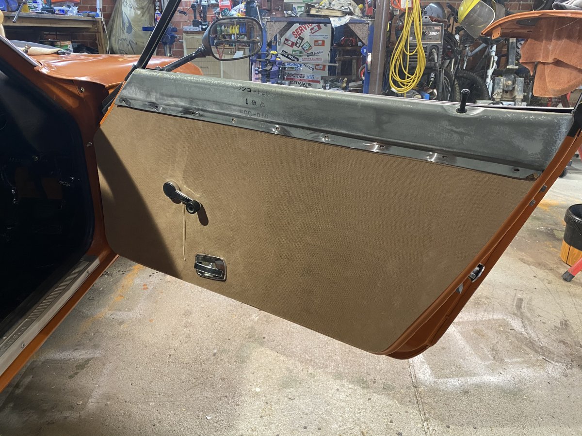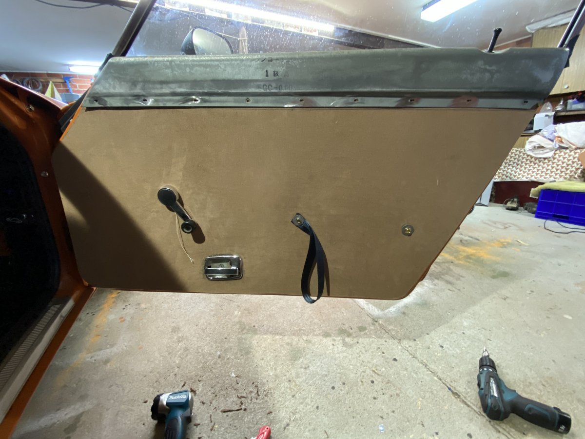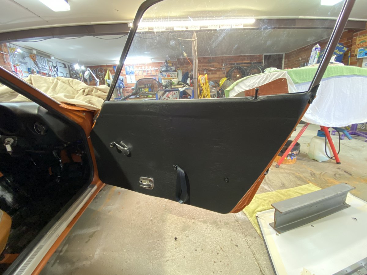 CBR Jeff Posted May 19, 2020 Author Posted May 19, 2020 New Door Cards I decided to make my own new door cards. I removed the original Masonite off the top metal section and replaced with new Masonite. then covered the entire card with black vinyl. The old armrests I had were toast so I replaced one end with a webbing pull and inserted a bolt into the other end that helps hold the card in place but can be used to secure an armrest later. I used the fluffy side of Velcro to replace the window runner section along the length of the door card top. It was a bit of stuffing around but they look the part. Not perfectly original but period. Jeff Ponyo240z 1 Quote