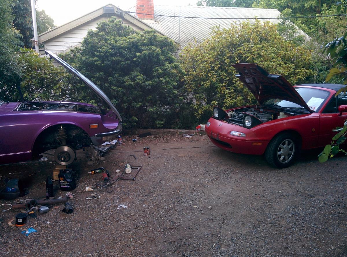 Andrew_L26 Posted January 20, 2016 Author Posted January 20, 2016 (edited) Well Well Well, Bubblegum is moving along nicely. I've had my front brake rotors reground and I rebuilt the front calipers which was surprisingly easy. Can't believe how close I was to spending 200$ on getting someone else to do it! Also, a new windshield was put in a few weeks ago, I was really surprised at the lack of rust. There was a tiny bit near the drivers side drain but that was easily welded up and ground down. Cut out some of my battery area and welded that up, There were a few pin holes in areas that I didn't replace. I think I will cut the whole area out at the end of the year (When I'm finished year 12) but the pin holes were covered by underbody sealer. I want to say that clearly here as I don't want to do anything shady. Also, I got addicted to underbody sealer.... Started just with where I did repairs such as the floorpan etc. And I noticed how black and tantalising it is.... Pretty much ended up resealing the entire underbody... I spent about a day cleaning it all up and to my surprise I found no rust at all! A few bits of surface rust where the old underbody sealer had chipped off but that was quickly sorted with rust converter and a bit of my favourite etch primer. Looks like I got to it all just in time! Started dealing tackiling my exhaust leaks which led me to chopping off my extractors and welding a flange in. Extractors were beyond repair as I found out after some patching up. I've now got an N36 exhaust manifold and an engine pipe on the way! Pleb life I know... Should have gotten some more extractors but anyway. As far as I know the only thing that is unroadworthy is my lack of engine pipe going to the rest of the exhaust. Other then that the car seems pretty darn good. I also took off my rear quarter cover things from the interior and I plan to rust convert down there and prime it all. I don't think it looks too bad but being honest, I'm now not even sure if I'm going to be the one to fully restore this car but we will see what the future holds! Now I just want to enjoy the car that I've put so much time and MONEY into. Once the exhaust is done I'm booking in for a roadworthy. I hope there aren't too many issues left for the roadie guys to sort out. I also hope that they don't think the pretty black underbody sealer is covering anything which I've just started to think about.... Does it look dodgy? I took a few photos beforehand but not an insane amount so I hope all is good... Anyway, enjoy the pictures and the insane BLACKKNESSSS of my underbody! Rear passanger quarter Blackness Lack of rust in the windshield sills? (Not going to lie I was so confused at what this lack of rust was. WHAT DO YOU MEAN I TOOK SOMETHING OFF BUBBLEGUM AND DIDN'T FIND ANY RUST?) Anyone know what these markings are for? Was my zed abducted by aliens in the mid 80s? My stuffed extractors Lonely exhaust pipe My now clean engine, It is leaking a bit of oil from the oil pan gasket but I plan to reseal it when I do my next oil change Blackness continues without rotors whilst they were off getting machined Also, my dad purchased a NA MX-5 for himself. Absolute bargin he got! (He is looking forward to some Sunday runs up in the Dandenong Ranges where we live! The pop up headlights has really gotten me back to the idea of pop up inspection flap lights for my zed... if I see some cheap and crappy inspection panels I'll continue with this silly little idea haha Bubblegum and the new Miata (Probably call him bouncer due to the blown struts which will be replaced soon) And finally, What do you guys and girls think of pop up headlights on a 240z,260z,280zx etc. I think I might actually do it one day just for a bit of fun. I will have to find somewhere to put the battery and washer fluid but thats pretty easy Edited January 20, 2016 by Andrew_L26 Quote