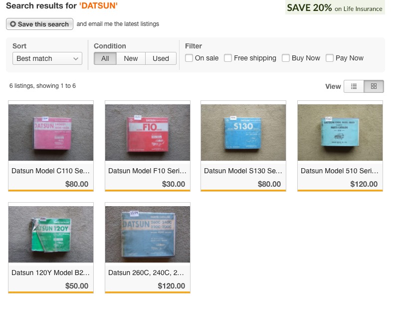 Administrators gav240z Posted November 18, 2016 Administrators Posted November 18, 2016 Nissan Parts Manuals for various Datsun's. Seller: Nelsurplus. http://www.trademe.co.nz/Members/Listings.aspx?member=2964692 http://www.trademe.co.nz/Browse/SearchResults.aspx?searchString=DATSUN&type=Search&searchType=Member_2964692&user_region=100&user_district=0&generalSearch_keypresses=7&generalSearch_suggested=0&generalSearch_suggestedCategory= Sorry I bought the S30Z one already. Quote