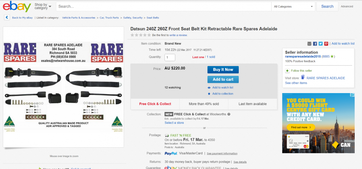 Aaron Neubauer Posted March 11, 2017 Posted March 11, 2017 Hi guys, The seatbelts in my 240Z are a bit tired and I am considering replacing them. I have seen people have used Hemco. I haven't contacted them as yet. I have found a rare spares kit on ebay, has anyone got any feedback on rare spares or have used this kit? http://www.ebay.com.au/itm/232246201378?_trksid=p2055119.m1438.l2649&ssPageName=STRK%3AMEBIDX%3AIT Quote