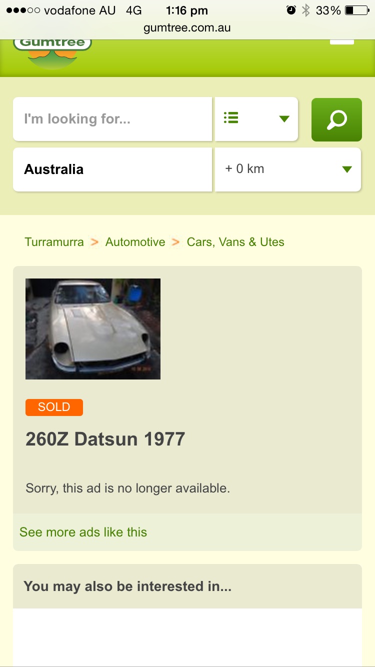 brent012 Posted February 18, 2015 Posted February 18, 2015 Must have been a good deal! It was pretty cheap (4.5k). Here's the google cache copy: http://webcache.googleusercontent.com/search?q=cache:oAsXI4nJfMoJ:www.gumtree.com.au/s-ad/turramurra/cars-vans-utes/260z-datsun-1977/1070743191+&cd=1&hl=en&ct=clnk&gl=au You can the other one in the fifth picture. Quote