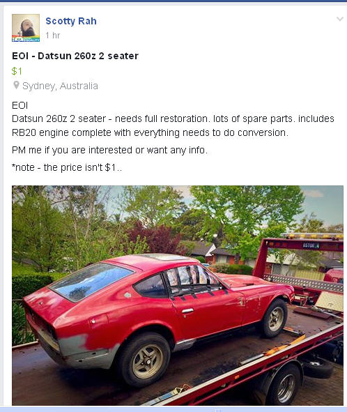 Macdat Posted October 12, 2016 Posted October 12, 2016 http://m.ebay.com.au/itm/172372395012 Starting bid:AU $14,000.00 Q.What do we think of this? Bit to be done still Panels: [/size] [/size] The shell of the 240Z has had the rust repaired, one of the better shells [/size]around[/size] [/size]to [/size]continue restoring[/size] [/size]([/size]see [/size]facebook[/size] page[/size]:[/size] [/size]https://www.facebook.com/MattCoy240ZRestoration/[/size] , for rust repair pictures). Only rust left in the shell is in the spare wheel well (I have another wheel well i[/size]n[/size] good condition[/size], require slight repairs,[/size] [/size]to be welded in) and some small sections around the front radiator support. [/size] [/size] The shell has had the chassis rails extended and [/size]some[/size] of the [/size]seams of the shell[/size] have been stitch welded, the shell has been setup to be able to handle some additional power.[/size] [/size] Front[/size] guards require a little bit of work (no rust, just a bit of [/size]panel beating[/size])[/size] [/size] Headlights scoops are in good condition.[/size] [/size] The[/size] front end of the[/size] bonnet is rusty[/size].[/size] [/size] [/size] Both doors have had the rust repairs completed, new skins fitted. Only thing left i[/size]s[/size] to hang them, adjust the gaps and to finish tapping down the skin.[/size] [/size] Rusty[/size] hatch[/size], it will require replacement[/size], comes with a brand new fibreglass hatch[/size].[/size] [/size] New weather seal kit sourced from the US[/size] [/size] All window glass included with the car[/size] [/size] Driveline:[/size] [/size] Original driveline specifications – manual gearbox (unsure if it is the original engine)[/size] [/size] New polyurethane bush kit sourced from the US[/size] [/size] Driveline components are complete, will most likely require rebuilds, due to sitting around for so long.[/size] [/size] Interior:[/size] [/size] New interior [/size]seat covers, roof lining, vinyl [/size]trim[/size] and carpets[/size] sourced from the US. [/size] [/size] Really good condition[/size] (uncracked)[/size] factory dash board.[/size] [/size] The centre console that came with the car is broken. I have sourced another one which is in OK condition and could be refurbished to suit the rest of the interior.[/size] [/size] The door trims are OK condition, small [/size]rips[/size] at the bottom. [/size] [/size] The plastic trims come with the car but could use replacement.[/size] [/size] Other:[/size] [/size] Comes with the majority of parts required for assembly, I bought the car dismantled and have not done a stocktake on all of the parts. [/size] [/size] Reason for sale:[/size] [/size] I have had the car for over 2 years and have not had the time to complete as much as I would like. As above I have sourced a lot of parts. I am looking at buying property and can’t justify spending the additional money required to finish the project. [/size] [/size] Contact me through ebay for additional details. Thanks, Matt. Quote