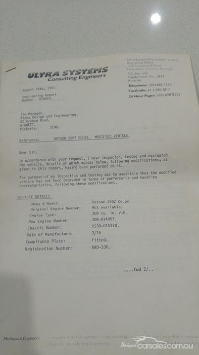 GongZ Posted December 19, 2016 Posted December 19, 2016 1976 Datsun 260z 2+2 Coupe $4,000.00 Tambourine Village, Queensland http://www.gumtree.com.au/s-ad/tamborine/cars-vans-utes/1976-datsun-260z-coupe/1132965534 Datsun 260 z 2 plus 2,project car,needs work but quite a solid body,original colour green metallic,no motor and box,mostly complete other wise,has period style jelly bean mags,was an automatic car,paint and panel work is quite reasonable but not perfect.come have a look if interested Quote