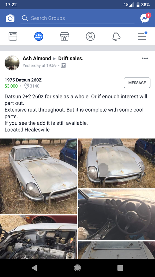 Administrators gav240z Posted February 26, 2019 Author Administrators Posted February 26, 2019 https://www.facebook.com/groups/740335446098903/1587185634747209/?sale_post_id=1587185634747209&comment_id=1588074964658276&notif_id=1551181737549769&notif_t=group_comment_follow Seller: https://www.facebook.com/ben.jackson.313?fref=gs&__tn__=%2CdC-R-R&eid=ARCuqXIJUzgU9Az4cmKtN6As5nZS9jeJTYlM4vsWLBQaUYQ2_LK9TibS923p6gIbkdEq22gte6pzyrCl&hc_ref=ARSoTWCira5KOcjvBfy3wqWFJcgL0ZfQ5szc_T6UDJoukrAU8bZ90B-1wFQWaxYKWjc&post_id=1587185634747209&dti=740335446098903&hc_location=group 1973 Datsun 240z for sale on Facebook. $13k. RB20 motor. Quote Hi people! Unfortunately reality has set in and the Mrs and I have decided, due to my health that we will be unable to restore our 240z so it has to go in favour of buying a house. I'll be completely honest the car has most of the rust I have heard everyone talking about, the rails will need to be done. I believe most of the parts are there to restore it, aside for the seats and door trims. Dash is in good condition. On jelly bean mags with centre caps. Has RB20det with manual box, exhaust manifold and turbo are there but not pictured. Surge tank under the car and a few other modifications. Has sunroof. The car is on stands in the shed I can take photos of anything at request and answer any questions or organise to check it out, price is negotiable I have simply set it to what the car owes me. Located moe. 3825 Quote
