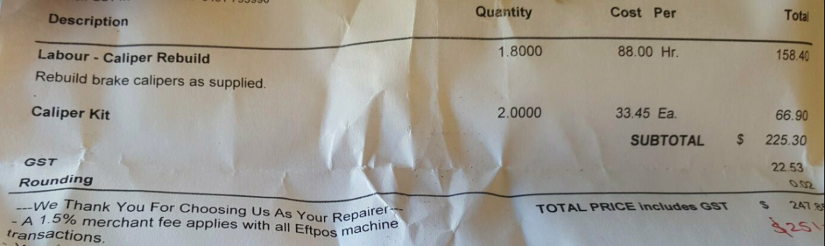 cracker Posted May 9, 2019 Posted May 9, 2019 240z/260z brake booster + Nabco 7/8 master cylinder (from 260z, includes proportioning valves as pictured) $150 ono Hilux s12+8 reconditioned & painted calipers (byo brake pads, rebuild receipt below) $250 ono pickup/delivery in Adelaide CBD on weekdays or can post at buyer's cost. pm or 0403527398 Cheers Quote