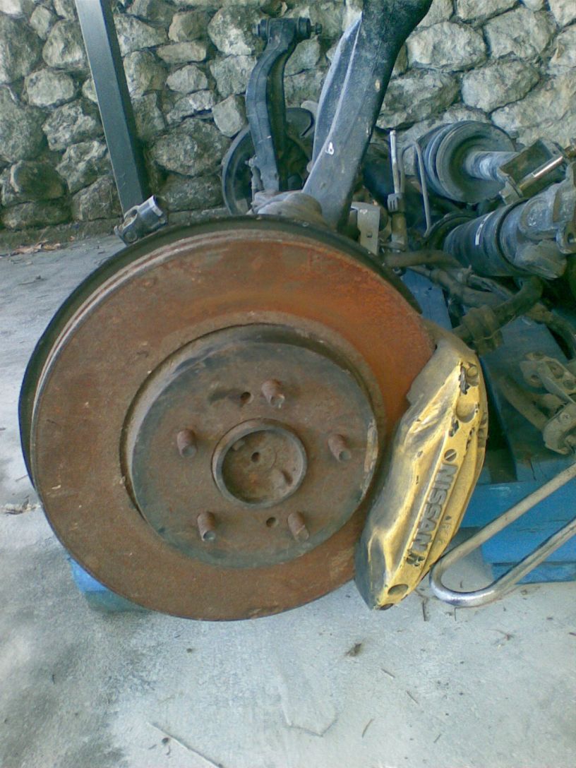Gaijin Posted October 21, 2008 Author Posted October 21, 2008 Using the z31 turbo 5 stud front hub, 8.5" wide wheel stock er34 disc and calliper - Fitment looks ok - Very heavy! Reducing unsprung and rotating weight should be my target. Going light with disc and hat, aftermarket calliper and alloy hub will make a great improvement for the money Lets start looking... Quote
