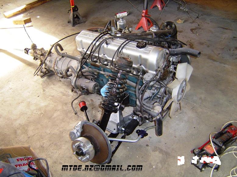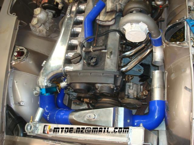 Gaijin Posted October 21, 2008 Author Posted October 21, 2008 Well, about time to tease those of you running carbs. (I will regret saying this) - Turbo, exhaust,gate,water intercooler,radiator into position. Pipework has more work to clear tight spots here and there. Modified TB location on intake manifold, to clear inner gaurd. TB running 80 degree to usual install method. Heat exchanger out front of radiator, pumped by bosch intercooler water pump (controlled by ECU) My deadline for road going widow maker is late Jan, for a family wedding, and of course in Feb, for a (NZ) Z club Taupo track day, to gently roll around the track whilst smoking a cigar (probably not legal now). Front end slowly coming together. Arizona z car struts, camber tops, 70mm longer bottoms arms, lengthened and adjustable tension rods, 5 stud ally hubs, ally disc hat, heavy duty rotors (more cooling vanes, thicker meat) of around 12.4" ish rotors, 4 pot wilwoods, ally mount. Roll bar and steering linkage needs sorting. Power steering now in and done, MR2 rack. This is a toyo-ta type. Found some ZG flares that will fit, extra wide front and rear. Thanks for the pics. Secret fuel system hidden in back, bosch 700hp efi pump, lift pump, filters, tank increased in size (modified original to increase fuel vol, and house a surge tank), and it all looks completly stock. Beauty. Quote