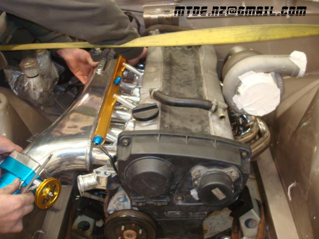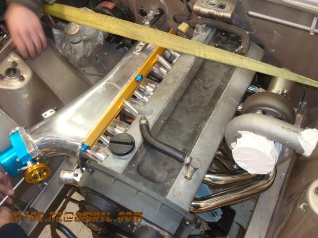 Gaijin Posted October 21, 2008 Author Posted October 21, 2008 Manifold choices are OK on the market, with short list including; - standard across the top (works fine) - chinese greddy copy ($, casting issues, % of rejects high) - Greddy ($$ , no bellmouths, hard to source 2nd hand or killer deal) - Aussie fabricated stuff ($$$, too many $ for the gain) - JP and Thai ($$, bellmouths, quality looks OK, deals available) Decided then! 80mm TB (attempt to keep intake velocity up, better response) SARD fuel rail (has 11mm injector holes, while manifold has 13mm. May need to open up rail diameter) General clearance OK, TB tightish to inner wheel arch. Anodizing is garish. Note engine position against firewall, nice'n'tight. 15mm odd clearance there. Also the height of engine relative to bonnet catch, with the oil pan off the JDM 200zr making life easy to drop it low. Compressor housing getting jiggy with the cam cover, will scallop out cam cover then Quote