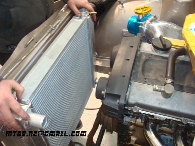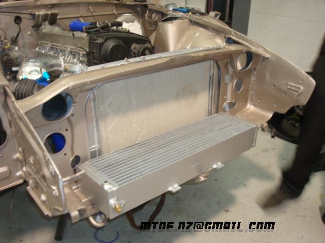 Gaijin Posted October 21, 2008 Author Posted October 21, 2008 Exhaust is prepped. I like the smooth 3" mandrel main. Wastegate is Tial 38mm (maybe big enough, if the boost is set nice'n'high) Position of wastegate pipe exiting manifold useless (lowest pipe in pic), with exhaust gas having to do a 180 deg. turn to exit. Hello boost creep. Will change this to improve flow to 'gate. One downfall of the 200 slide chinese unit. Arizona Z Car aluminium radiator, non cross flow, pipes not in the right place either, lucky the xchange rate is still OK then! Bolts up to stock mounts, but this is sans rubber mounts, which would ensure the ally welds would fail quickly. Time to apply mods to radiator then. People talk about the weight savings of ally radiators. Maths do not look good! ($/kg). Cheaper to ditch the passenger. Quote
