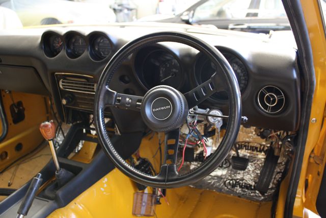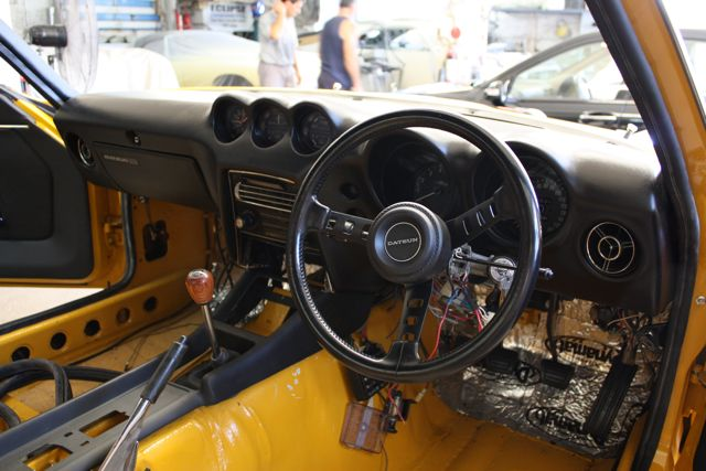 acf321 Posted January 22, 2011 Author Posted January 22, 2011 Its been about three months since I went down and had a look at the Hornet .. it was a much needed break for me, and by bank account. Nat's been busy though .. and I took a few photos. The car is very nearly ready to be driven now. All we really need to do is complete the interior (seats are done), balance the wheels, add a battery and exhaust and the car should be right to go. A few more things like the correct length of door seal rubber, aligning the rear hatch, putting on the bonnet, and finalising electrics. Here's where its now at; 1) Selector is now installed with 4 speed gear knob (i will be chasing up a 5 cog number in due course). This was just done by gently heating and bending the rod back dramatically from the centre point, as was done in Lurch's red car. I have a photo with the console in place, and the car in 1st gear, to show how much room we have left, not much, but sufficient. The transmission feel is genuinely like a rifle bolt, given the tranny is rebuilt, and there are all new bushes in the selector. The shorter shifter feels rather more like an MX5 too, which is not a bad thing, 2) Dash is installed, including the magnificent Cali-clock from my very good mate Mike. All the dials have been disassembled, cleaned, and the lens cleaned. They really look impressive in the flesh, and like new, 3) The Compe Steering Wheel is on and looks just perfect.. Old School Fast look 4) All electrics are now operational, and the centre console is all connected, with new rods for the air vent and heater controls. The fascia is the original one, and is a little shabby, but does remind me the car is a 71 model, and not a 2011 model. I restored the side vents (with super fine steel wool that made them like new) but have yet to complete the middle vent, 5) Centre console fits perfectly, but will need the small holes drilled for the rear following my refurbishment of it last year, and we'll be re-spraying it in the correct 2-pack paint to ensure it wears better than the cheaper canned stuff that's on it now. I think it looks great, and given it was a busted up mess when I got it, it really looks the part, 6) Fuel lines are in, including elec fuel pump, and regulator (see photos). We went for a simple type single line and have not put in a return line yet, but should there be an issue with this, we'll add a return later, 7) New door cards are in, and they look brilliant! - still available last year so if you have the means, grab a set via Nissan while you still can. 8.) Seats are recovered, but as I was not happy with the tension of the fabric, they'll be going back to be re-done. Enjoy the photos. Shouldn't be too long now! Cheers Adam Quote