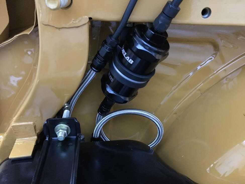 KatoKid Posted January 4, 2017 Author Posted January 4, 2017 Well the lead up to Christmas was hectic for work as well as family so I didn't get much accomplished on the project......but happy to say the fuel system is completed, wiring, installation of fuel module and tank, filter, hard lines and braided lines at each end. I went with a bigger Fuelabs filter which necessitated a new bracket and I had to put a loop in the braided line as it was too short to run direct to the pump outlet on the module. Braided lines at the engine bay end were easy enough but when I pressurized the system I found the slightest weep on the AN flare side (not the side where I made the fitting to hose joint). I undid this and gave the male end a clean up with some fine wet and dry and it looks to have fixed it. All the other connections are dry which makes me happy. Quote