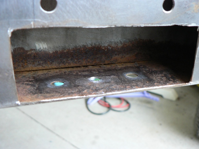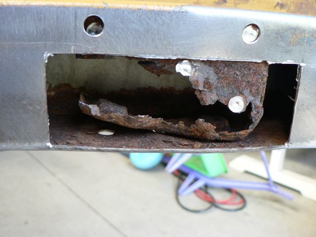 KatoKid Posted November 10, 2010 Author Posted November 10, 2010 Next job......I found some rust holes in the front of the LH chassis rail above where the sway bar mounts. Could see some spot welds so envisaged there was a bracket of some kind inside the rail to reinforce the mounting. I cut out the offending area and found what was left of a reinforcement inside. The reinforcement was pretty well gone so I drilled it out and cleaned up the surface rust on the bottom of the chassis rail. The top and both sides inside the rail looked surprisingly free of rust. Seems anywhere they have layers of steel in these cars it attracts the dreaded rust worm. Quote
