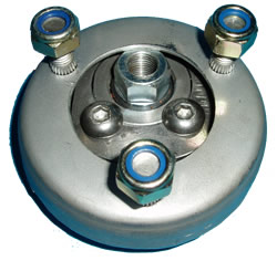 The Ground Control camber plates feature two sets of bearings, a proprietary bearing, made to our specs by Aurora in the USA, which allows for articulation of the shock shaft. This spherical bearing is very understressed, as the Ground Control design does NOT support the weight of the car on the spherical bearing. Instead, the weight of the car is supported by a completely separate articulating needle bearing, which is also manufactured for Ground Control in the USA.