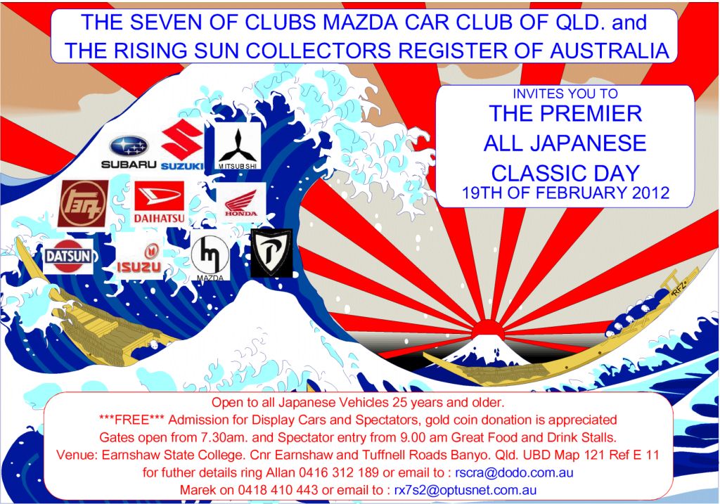 24 Dat Posted January 17, 2012 Posted January 17, 2012 Hi all, Just to let you know that the All Japanese Classic Day is on again on Sunday the 19th of February and is organised by the Rising Sun Collectors Register of Australia and the Seven of Clubs Mazda Car Club of Qld. Inc. The All Japanese Classic Day is open to all Japanese Manufactured Vehicles 25 years and older. There will be a separate area for your modern Japanese future classic if you want to bring it. The show is at Earnshaw State College Earnshaw Road Banyo UBD Map 21 REF E 11. Entry will be off Earnshaw Road and the gates for display cars will be open from 7.30am. Spectator entry will be from 9.00am Your cars need to be parked up by 9.00am Admission for Show Cars and Spectators is ***FREE YES FREE*** a gold coin donation is not mandatory but appreciated. Your car doesn't need to be in showroom condition it is a great day to bring your car out and see all the other fantastic Japanese cars there on display , last year there was over 200 cars there in 35 degree heat so this year it should be even bigger and better and hopefully a lot cooler. The ZCCQ will be there and we will have the club Gazebo up for some shade on the day for us all to enjoy . Please PM me or post on this page if you will be coming along, I know the organisers and i can make sure we have a big enough area to park all the Zeds together. There is the usual coffee, food and drink vendors there on the day. Don't forget to bring a chair! I have attached the poster and the entry form for the day please fill out the entry form as will just save you a bit of time on the day Hope to see you there Cheers Dave 27922_702c55b6ac05d13830c0f48b0210069ea3b657fd.doc Quote