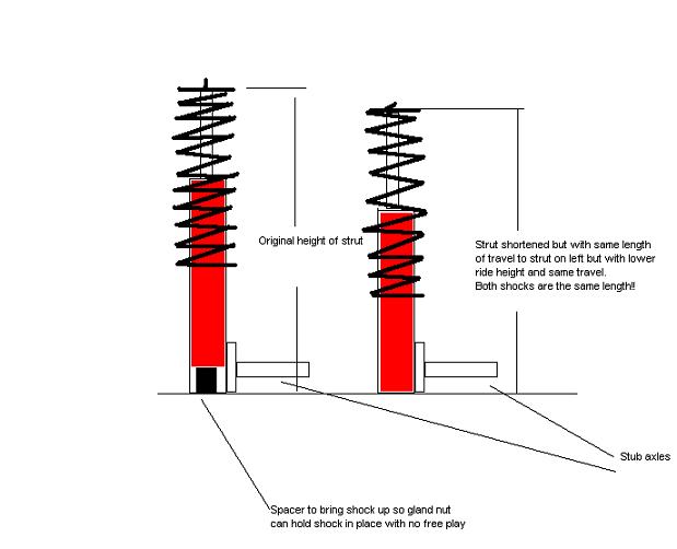 Moderators Zedman240® Posted April 1, 2012 Moderators Posted April 1, 2012 If you section the strut the same amount as the spacer that lifts the shock up, you will lower the car but retain the same amount of shock travel. I've drawn up a quick crude drawing to show what I mean. Even with a coilover setup, if you lower it even further, you will lose travel in the shock. Be very careful with Koni shocks.. one event of bottoming out, and its rebuild time with your shocks! Quote