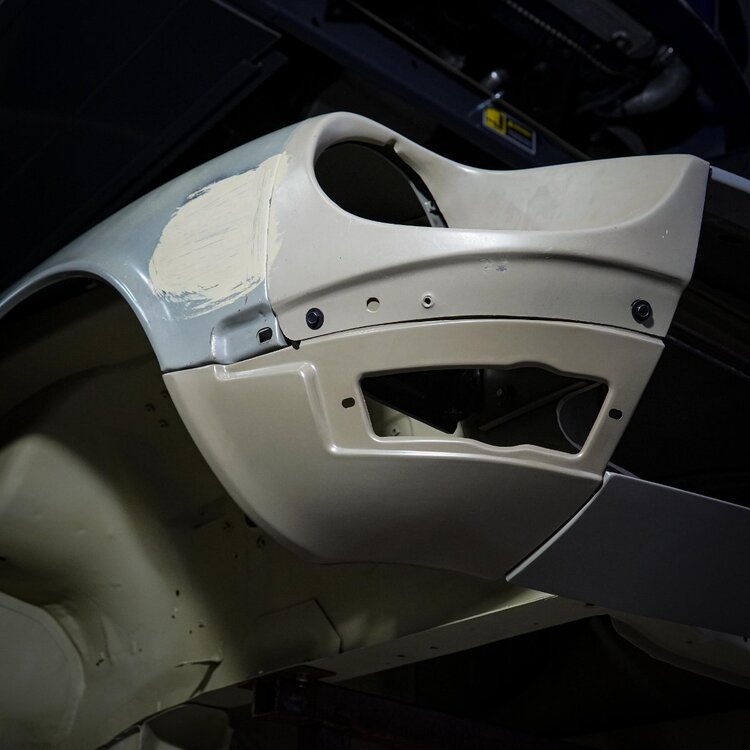 George had done a lot of the big jobs like fitting the suspension, drivetrain and dash. But once #19 was unloaded we took stock of all the parts: Some parts needed replacing, some needs refurbishing and some needed painting. The doors needed to be assembled with their glass and mechanisms, door cards installed, the tail light panels needed repairs and painting, the fiberglass centre console need repairing and painting, it needed carpets, a front bumper, bonnet hinge torsion rods straightened and installed, interior plastics installed... Basically we were going to be undertaking the last 50% of reassembly. So on with the photos in no particular order: The window tinder mechs were seized & in terrible condition, so we bought new T3 items. Checking 1/4 glass frame fitment: Plumbing the fuel tank: TBC...2 points