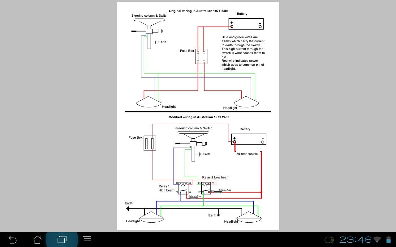 You know zed are wired a bit different in the headlight department. The fuses are for lh and rh not hi low like most expect. And the switch connects the earth to the circuit. So if someone has done a relay conversion and did not do one of the following you can have issues. 1. Take the factory setup in consideration and place the relays in the correct location in the circuit. 2. Rewire the headlight and switch to suit the required relay design. I have included a screenshot of the Atlantic Z pdf show one way of doing it. This changes the headlight from having the centre tap connected to power and switching the earth to having the centre tap connected to earth and via the relay connecting the power. One more thing is your switch working correctly. The issue with the zed setup is the switch sees the full current as it makes the connection to ground and closes the circuit. It is for this reason most install relays. Do you want all the current so close to you or the steering column (the earthing medium in the case)