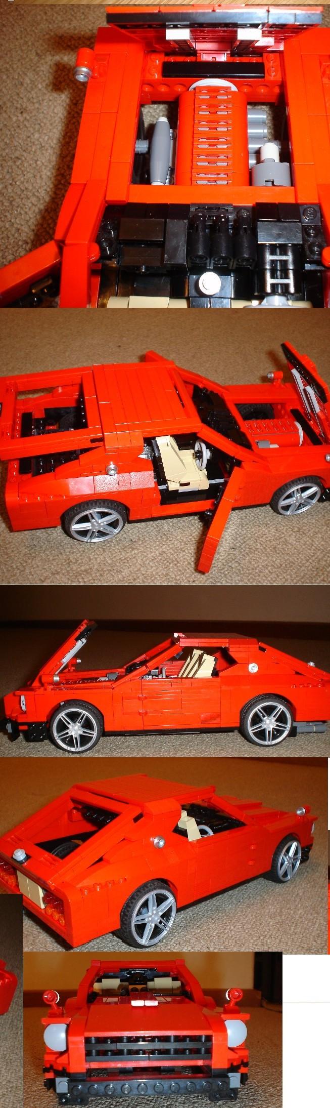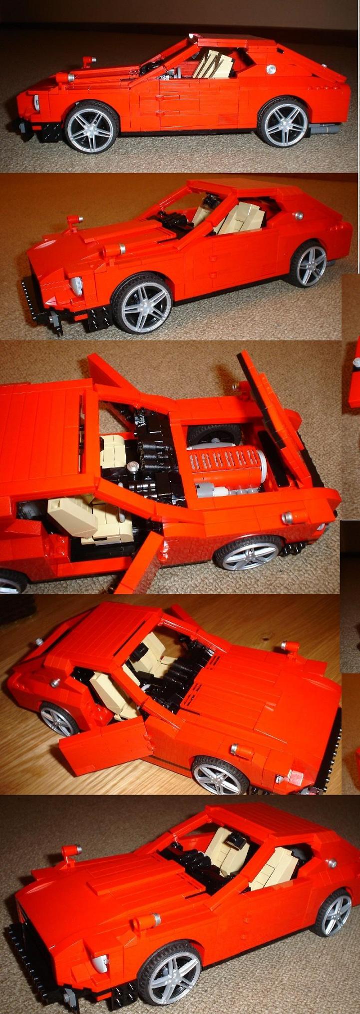 well being probably one my most favourite toys as a kid i decided to make a 240z model out of lego pieces. i had some old lying around and bought few recently to set me off to this quest. this was my first attempt at it. still not finished as i ran out of pieces. also some extensions are necessary to improve overall proportions. though i still need to source some more lego so if someone has stashed somewhere and not longer needing it let me know. im planing to build lot larger scale out of technics with piston engine suspension etc.. but still collecting bits and pieces. so any old techincs or normal lego will help me. here are the pics. its approximatrely 30cm long 10cm wide and about 10cm high. has a electric motor so it can go forwards and backwards. due to this the seats had to be positioned lot more forward. but may remove the electrics and have a normal rolling model.