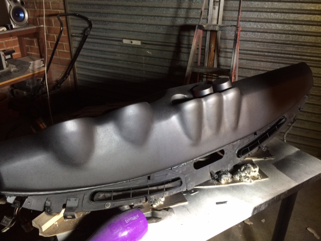 Update on the DIY dash resto! After carving out the cracks and excavating under the surrounding vinyl or the cracks I filled with 'expandafoam'. Once that had set I then cut down around 1.5cm to give sufficient depth to the bumper filler that I used as the solid substrate. I built this up and sanded between layers to check height and adhesion. I ended up putting a skim coat over the major affected areas and sanded it all to shape. I was still concerned that the rest of the vinyl was easy to crack just by pressing my finer into - not wanting to fibreglass I had this crazy idea of sanding (for adhesion) and them applying POR-15. POR-15 sets rock hard so I applied 4 coats, sanding every 2 coats. After the last coat I sanded for a nice flat finish and then applied Texture bumper paint which has given me a light sheen textured finish without the 'high gloss' - pretty happy with the outcome - total cost $55.00!!