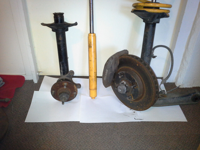 z31 front struts with adjustable Koni Yellow inserts (8641-1060 sport) and z32 4 sport calipers with r33 discs (blanks drilled to 4 stud). (interestingly the z31 struts are also 51mm diameter)