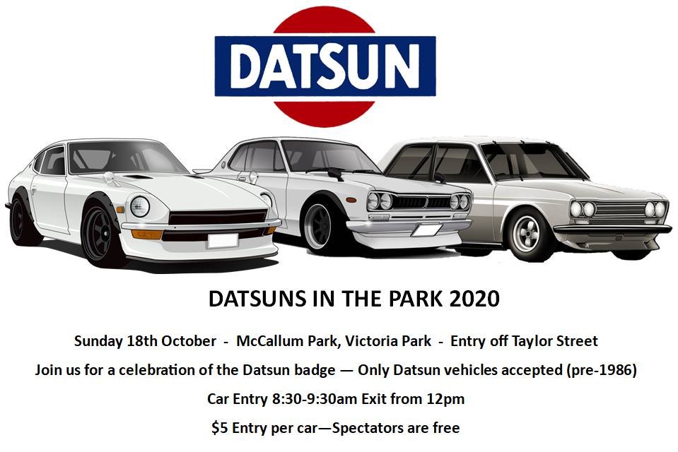 Its that time of year for the Datsun 240Z/260Z register of WA and Datsuns in the Park show and shine day. Sunday 20th October 2019. 9:30am to 10:30am park up. 2pm exit. Being held along the southern river foreshore of McCallum Park, entry at the end of Taylor street Victoria Park. This year celebrating the 50 year anniversary of the Datsun 240Z. All zed models past and present are invited along with Datsuns of all years. We have Nissan Australia supporting us by displaying a 370Z Nismo and 50' Anniversary Nissan GTR. Coffee van and food truck will be onsite. Please see the facebook page https://www.facebook.com/events/458520211666000/?active_tab=about for updates.