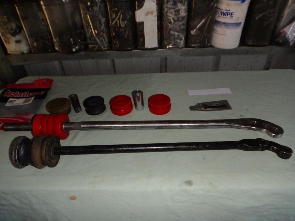 Hi All This is not my idea,i pinched it , there maybe other ways to make it work .This is what I did to make it fit. If you find i have omitted anything or missed a step ..................... First ,BE SAFE, jack your car up and use some sound axle stands before working under your car.Take some measurements of the caster arm length to front lower control arm. Use this measurement to get close to what you had after you installing the new arms .Then get it properly aligned as soon as possible. The thread on the Falcon caster arm is 18mm x 1.5 Tools needed: - Pair of Ford XD,XE and XF Falcon caster arms with nuts and large cupped washers - angle grinder with cut off wheel and flap disc for finishing - drill press or pistol drill - 10.5mm or 13/32" drill bit - Marking pen and scriber - round file( Lots of elbow grease if you use this) - spanners or shifters to fit adjusting nuts - bush kit from Mazda RX7 series 1,2 and 3, Nolathane Part no 48021 Try EZIAUTO parts on line Tool that will make life easier if you have them : -18mm x 1.5 die or die nut - 26.5mm reduced shank drill bit -18mm or 23/32" drill bit (to drill ZCar cupped washers) -Die grinder - vice -clamp -powder coating(optional) Zcar in foreground Falcon at the back Thread on Falcon arm extends down further from the end an are larger diameter Knock out the facon studs place z car arm over falcon arm and mark where the new holes go. lop off the end Spot drill ,and then drill through on the drill press Notch out small area to miss the swaybar drop link Drill or grind or file the mounting hole on chassis brackets to accommodate the larger diameter bush kit The hole required is approx 26.5mm with this new bush kit You can drill out the Zcar cupped washers that go either side of the mounting bushes or maybe use the falcon ones