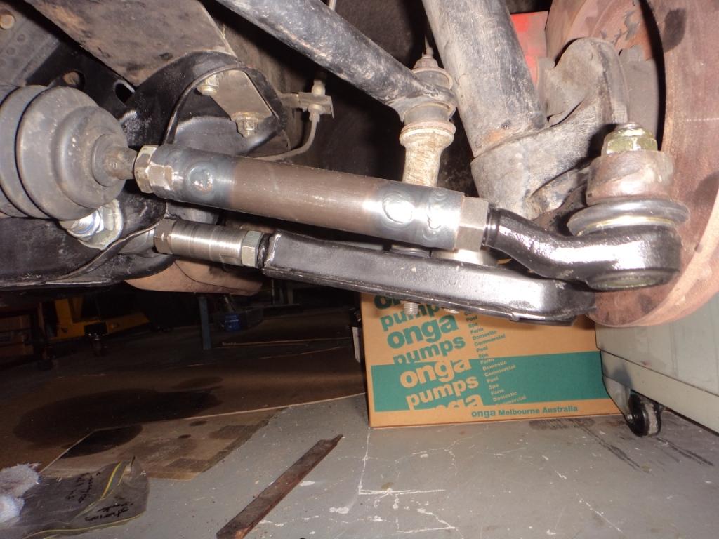 Made a pair of custom tie rods as per Whittie's instructions( A BIG thanks to you Whittie),also knocked up a pair of front adjustable control arms a few weeks ago .The control arms are mounted through the original holes in the cross member.I have some bumpsteer spacers, but the angle of the control arm and steering arm look good to me,so the spacers can stay in the packet.The car is on full droop ATM i might remove the coil spring to see the full travel just to be sure.I can't find any inner steering arms of the left hand variety and hints would be good.