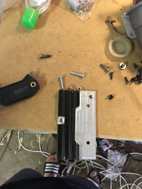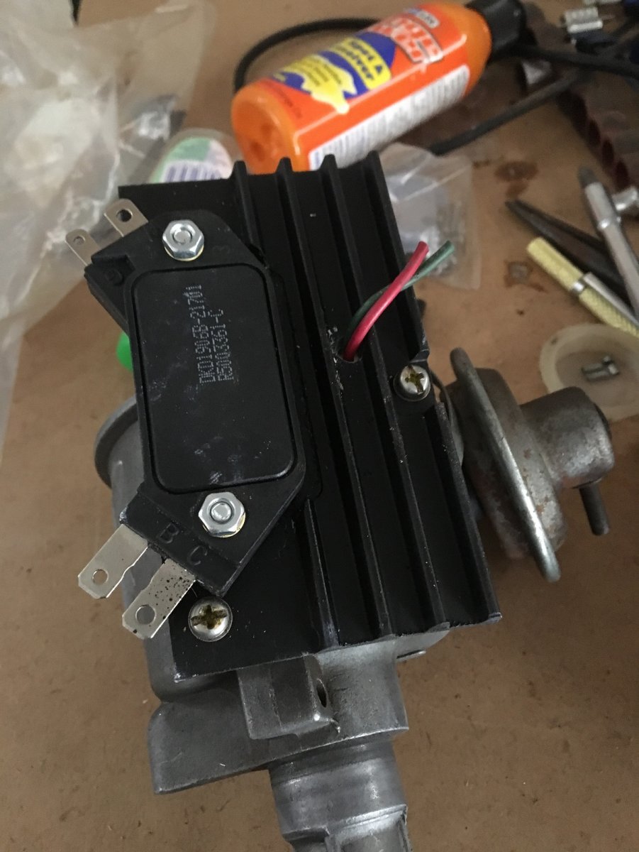 My "reconditioned" 280ZX distributor decided to die on me not long ago. Replaced the matchbox ignition module with a GM HEI module. Removing the matchbox there was a red and green wire from the pickup. These were connected to the ignition module. Wiring is as follows: On HEI Module W - Red pickup wire G - Green pickup wire C- Coil Negative B- Battery positive Module ground - Chassis ground Using a non-conductive heat paste may cause issues as the metal plate on the HEI module is ground. Cut up an old amplifier heat sink and cleaned it up on the mill. I attached the heatsink to the distributor via the matchbox mount screws. Heatsink was also kept bare where it meets the module as the paint acts as an insulator. Could be a bit tidier, but have been running this for a few months and hasn't caused me any issues.