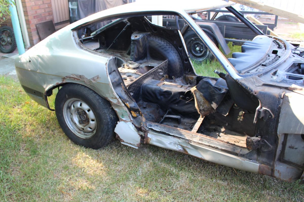 I feel its about time that i introduced myself, i have been a member for over a year but only acquired a 240z a few months back off a forum member. the 240z i ended up with was number 351 a accident damaged shell that i plan on restoring with my father, its had a nice hit to the side a couple of times judging on the body filler, but is pretty rust free. included a couple of unflattering pictures as it sits these pictures were taken just after i got it.(bit of wood was so water would run off the tarp, shed roof was leaking)