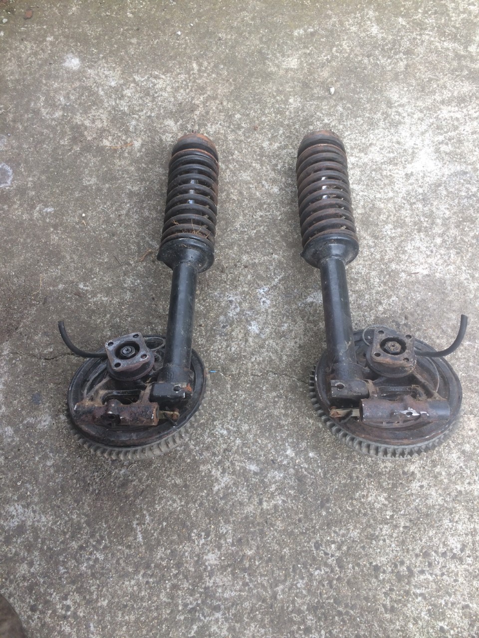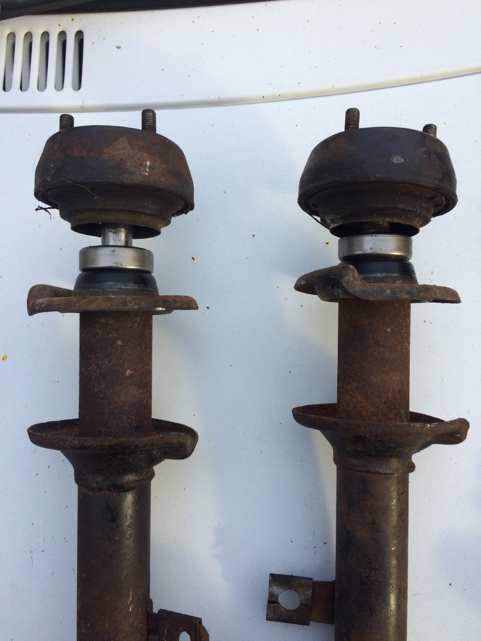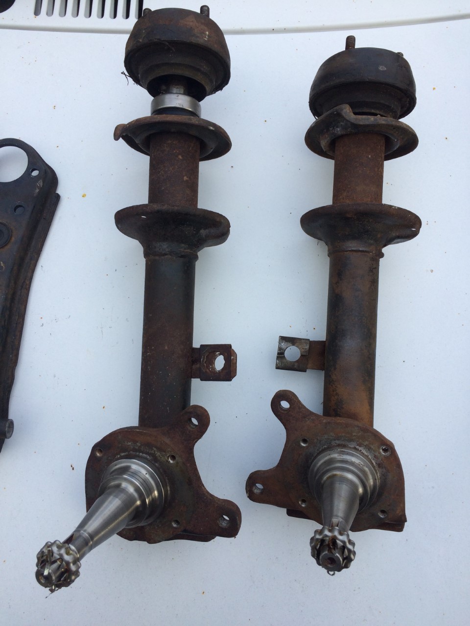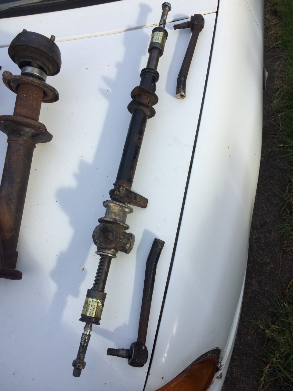 As you can see in the photo i took the tie rod ends and boots off the steering rack and it all looks good, it had plenty of grease and no signs of moisture or shaft play in the rack. There were no splits in the rack boots but i would probably change them as they look old as well as the tie rod ends. after pulling the brakes and springs off the front struts I found that the shock will not decompress so they would need a rebuild. the bearings in the strut tops are still fine. front engine k frame and lca's have surface rust but still quite strong and usable.