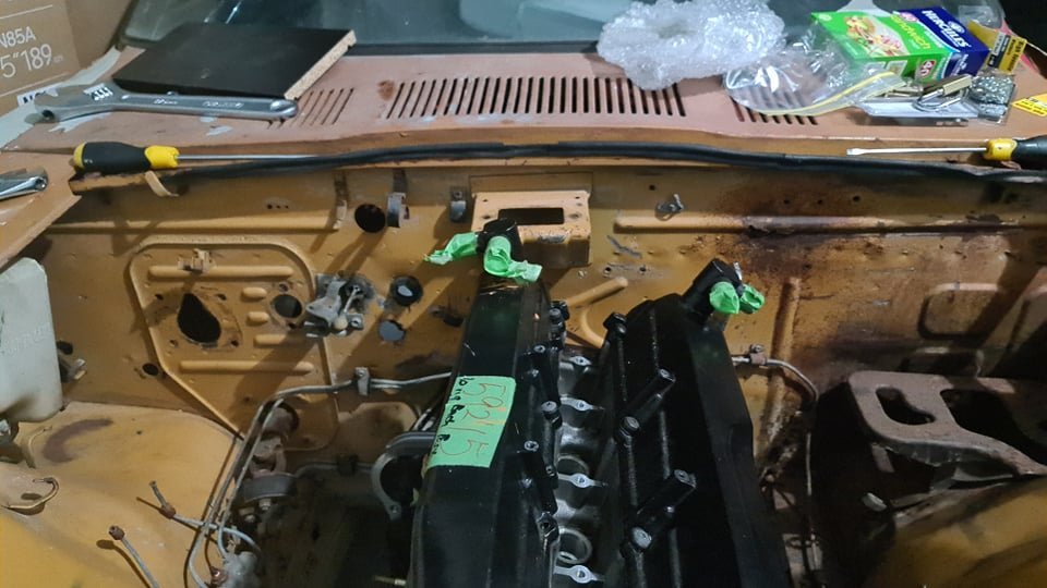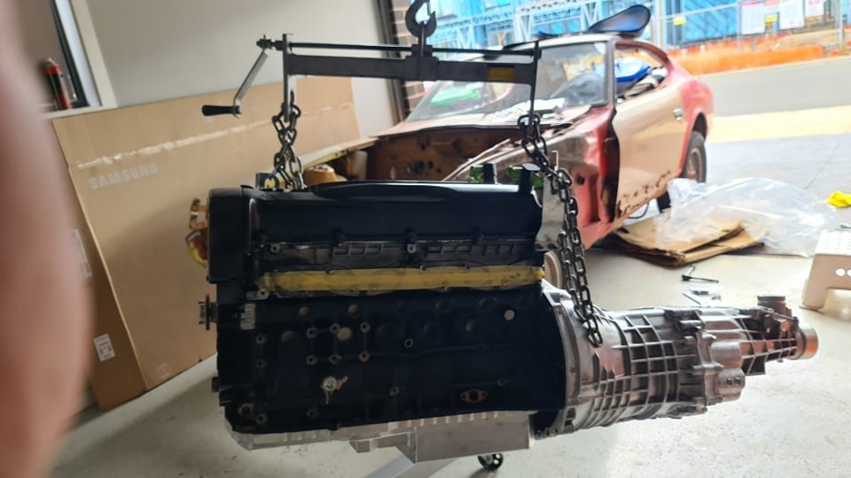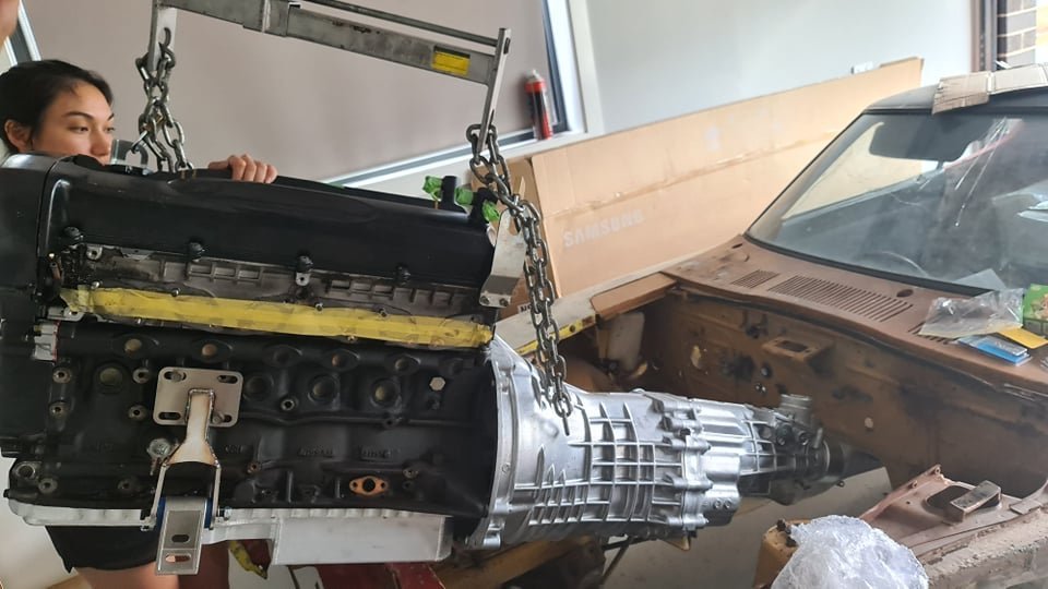 Hi all, Just thought I would share. I last year bought a rusted 1970 240z roller they had also came with an L28 that was mated to i think a 4spd Auto. I had always planned to go down an RB route but couldnt get started till now. So here I am now So anyways, Ive got a bit of a project a head of me but prior to placing it onto rotisserie and sending it off to the blasters, I wanted to mock fit the RB26 and new r34 GTT Gearbox into the car first to see how everything fits and check if anything needed to be modified within the tunnel as I was told engineers could become quiet difficult and picky once the tunnel has been modified. RB needs to come back out anyways as i will require a rebuild. I purchased the swap kit from CX Racing. LINK: https://www.cxracing.com/ESK-OP-RB26-240Z - Oil Pan - Oil Pick Up - Engine Mounts - Transmission Mount So everything arrived by the 2nd week of January (mainly waiting on the RB from Japan). First off, L28 engine+ Auto comes out. The original oil pan bolts are too short to fit through the new oil pan. Ive got some M6 x 30mm bolts to mock fit the sump on. Then i mated the tranmission to the RB (Sandwich plate is not installed as I dont have one yet but im only mock fitting for now) I noticed, there is still a small opening between at the bottom behind the oil pan into the bell housing. The original oil sump covered this area. Not sure on what to do here, either I make something to cover it up or look for a bracket. If anyone knows or can point me to the right direction that would be great! Anyways, engine mount goes on. Left side Right Side Also note. The original oil dip stick will need to be relocated as the oil pan is now towards the rear. Here we goo!! (Got the wife helping ) I gotta admit, this took me some time to get it all in, aligned and mounted properly. Had to rest it on stands, adjust the chains and rotate it every so often to get it in place. Left side Right Side Underneath From the front I do have concerns at the top where cam breathers are. Not sure if the bonnet would latch and shut properly so I'll give that a go over the weekend. I might still be able to rejig the engine around as I have fully secured it all down yet. Transmission mount plate with Nismo gearbox mount. It mounts directly up to the orginal braced mounting locations which is perfect for me So yeah... that its from me for now. It will come back out very soon for sand blasting, panel work and paint. If anyone has any pointers or things to look out for that would be greatly appreciated. P.S experiences with engineering an RB in NSW would be greatly appreciated too! Cheers! Tim